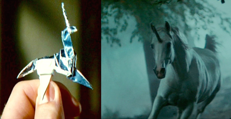 BladeRunnerK9WEBSen sijaan Deckardiin on istutettu väärä muisto, yksisarvinen. (K9) Monesti tässä yhteydessä puhutaan virheellisesti univisiosta, mutta Rick muistelee eläintä silmät auki. Kohtaus myös tapahtuu sen jälkeen, kun etsivämme on käynyt Tyrell-korporaation tiloissa testaamassa Rachelia. Todennäköisesti mies poimittiin salaa mukaan kokeeseen juuri tällä käynnillä.