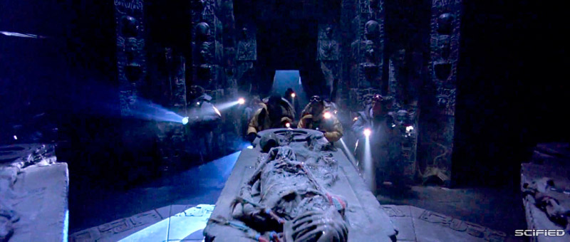 Tutkijat näet löysivät aiemmin ”uhrikammion” (K5), jossa alienit synnytetään. Kammion kivivuoteilla makaa edelleen muumioita, joilla on ammottava reikä rintakehässä, ja joiden ympärillä pyörii kuivuneita facehuggereita. Näillä vainajilla on kuitenkin yllään vaatteet, jotka viittaavat lähinnä intiaaneihin (K6) – eivät sadan vuoden takaisiin valaanpyytäjiin. Jos leikitään, että kyseessä ovat atsteekit, joista elokuvassa on aiemmin puhuttu, niin muumiot todistavat huoneen olleen käyttämättömänä jo 500 vuotta. Sebastian ei moisesta tosiasiasta tajua mitään.