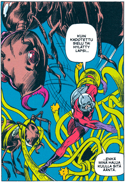 Tarjolla on siis aineksia suureen kosmiseen välienselvittelyyn, jossa sankareitamme revitään suuntaan jos toiseenkin. Ihastuttavasti kaikki alkaa kuitenkin hyvin pienen mittakaavan tapahtumista. Kun Vision-androidi kellahtaa kumoon Kostajien tukikohdassa, vain Muurahaismies voi selvittää, mikä on vikana. Fantastic Voyage -leffan (1966) tapaan hän pienentää itsensä mikroskooppiseen kokoon ja lennähtää Visionin scifistisiin sisuksiin etsimään syytä androidin elottomuudelle. Rulaa ihan ehdottomasti.