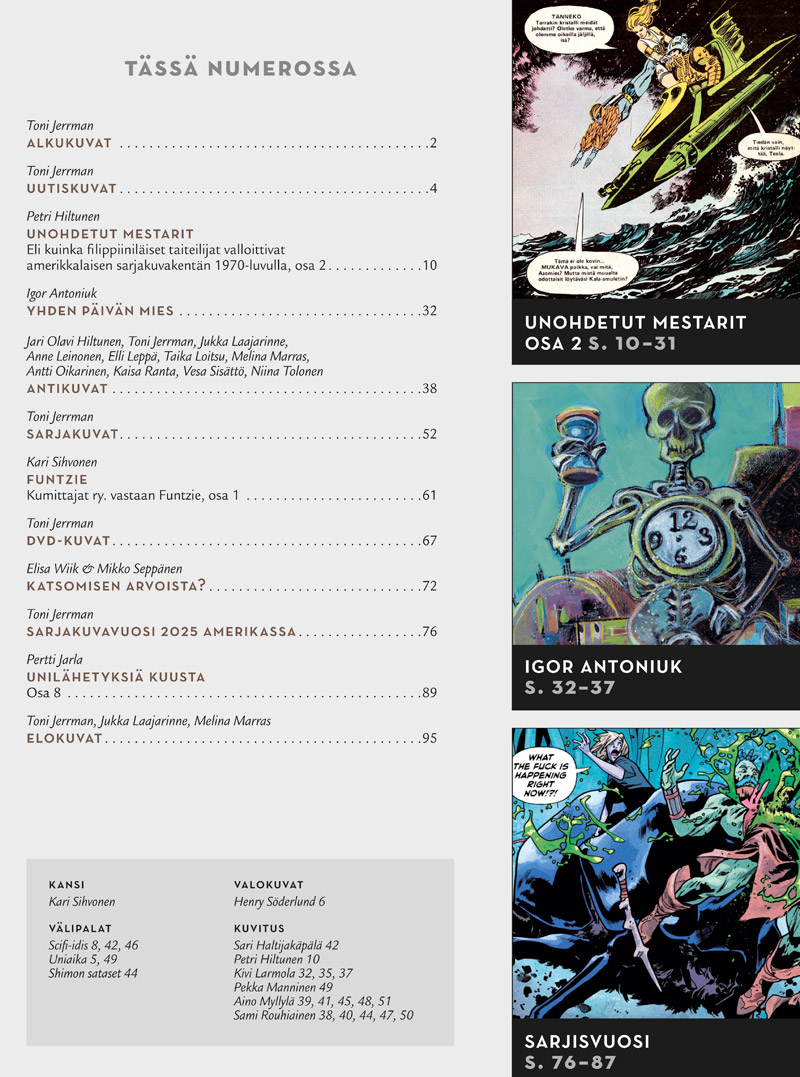 Sarjakuvaosastolla kehiin palaa Pertti Jarlan Unilähetyksiä Kuusta -jatkosarja ja Kari Sihvosen Funtziesta käynnistyy kolmiosainen Kumittajat ry. vastaan Funtzie -kokonaisuus.