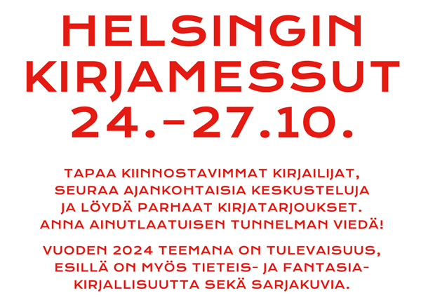 Kirjafanien vuoden kohokohta eli Helsingin Kirjamessut tekee jälleen tuloaan! 23.–26.10. kaikki kirjallisuuden ystävät suuntaavat kohti Helsingin Messukeskusta. Ohjelmaa on tavalliseen tapaan tarjolla runsain mitoin.