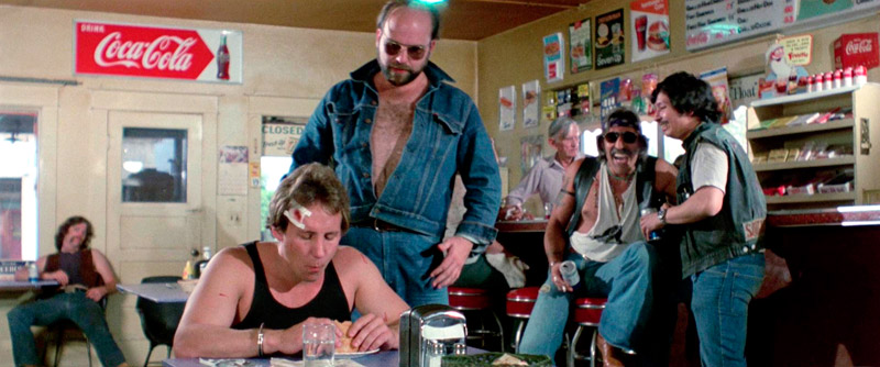 Aika pian käy ilmi, että aseilla ei tappokolmikkoa pysäytetä, korkeintaan vähän horjutetaan. Päähän osunut luoti saa yhden heistä kuitenkin rääkymään ja pyörtymään. Tästä käynnistyy turha sivujuoni, jossa vangittu tappaja karkaa poliiseilta, päätyy uskovaisten vanhusten pyörittämään kahvilaan ja saa kimppuunsa lauman maailman tyhmimpiä moottoripyöräjengiläisiä.