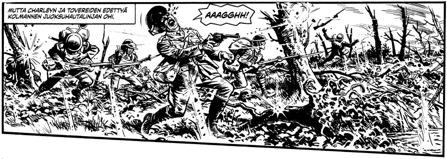 Itse tarina ei juutu vain juoksuhautoihin, sillä sivuhenkilöiden kautta päästään tutustumaan myös ilma- ja meritaisteluihin. Charley itsekin nähdään useassa roolissa aina lähetistä tarkka-ampujaan ja teloituskomppanian jäsenestä paarinkantajaan. Lisäksi sarjakuvassa vieraillaan kotirintamalla ja törmätään sotaa muovaaviin keksintöihin, kuten ensimmäisiin tankkeihin, valtaviin ilmalaivoihin, massiivisiin pommikoneisiin ja raskaasti aseistettuihin panssarijuniin.
